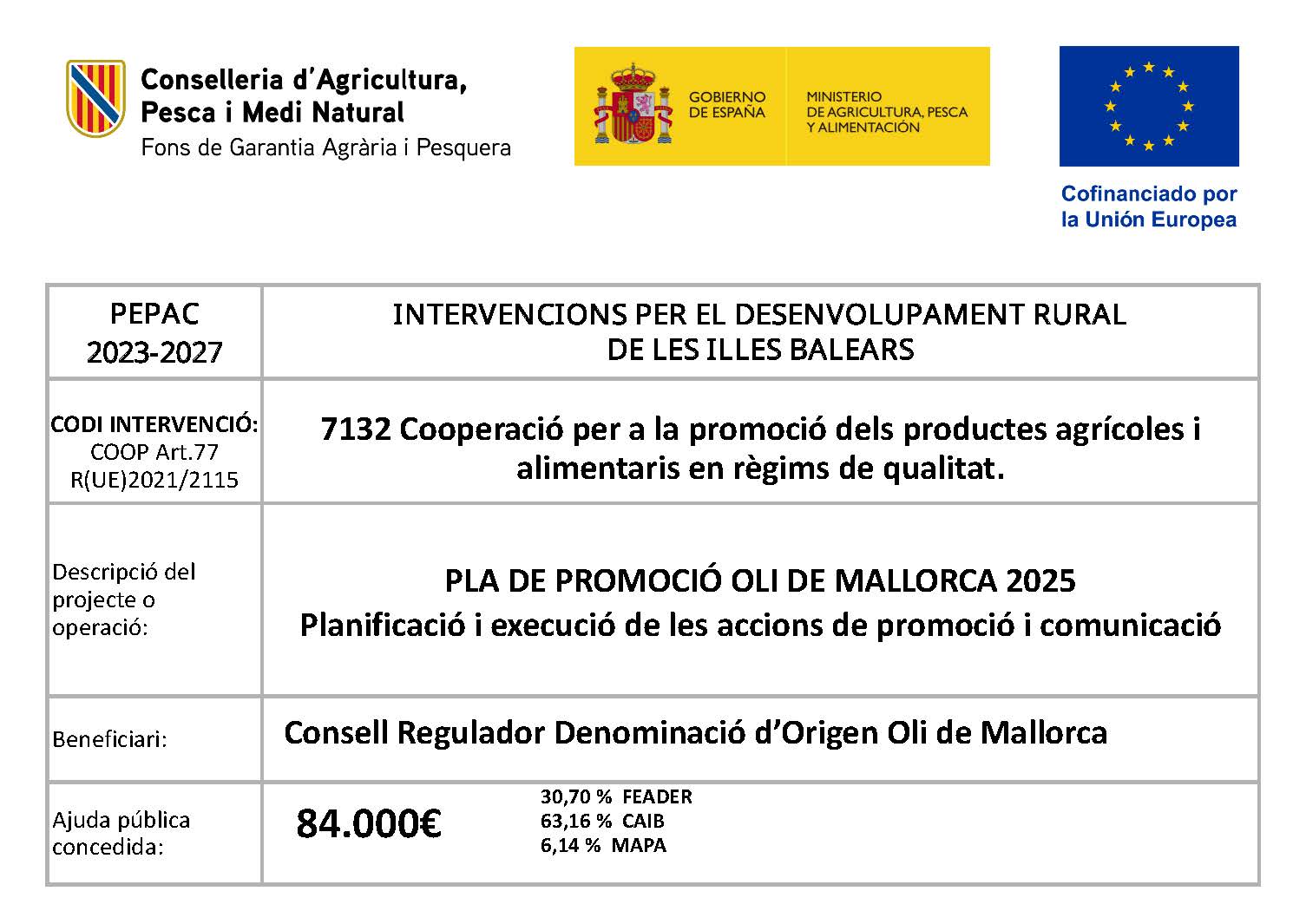 El Consell Regulador de la Denominació d’Origen Oli de Mallorca ha comptat amb el suport econòmic del Govern Balear a través de FOGAIBA, cofinançament de la Unió Europea (fons FEADER) i el Ministerio d’Agricultura, Pesca i Alimentación per a la planificació i execució d’accions en la promoció del segell de qualitat.